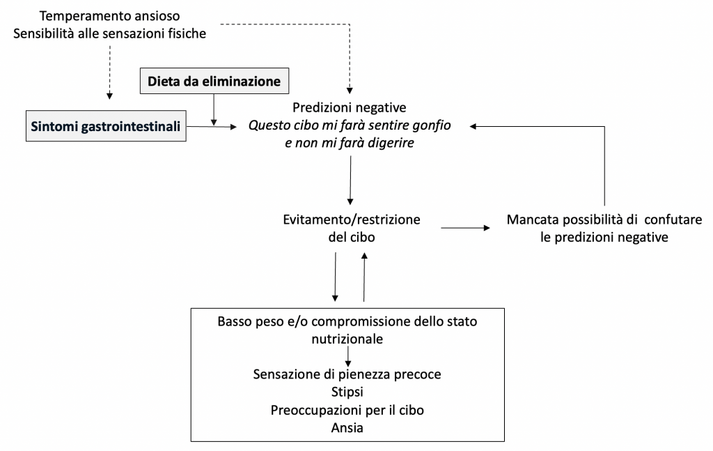 In accordo con questa teoria, i sintomi gastrointestinali e la dieta di eliminazione possono scatenare o mantenere il disturbo dell’alimentazione attraverso i seguenti meccanismi (Figura 1):